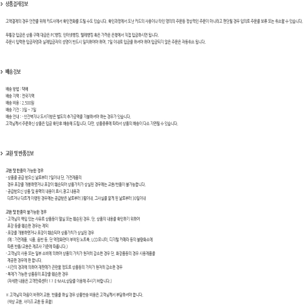 - 교환/반품/보증조건 및 품질보증기준은「소비자기본법」에 따른 소비자분쟁해결기준에 따라 피해를 보상