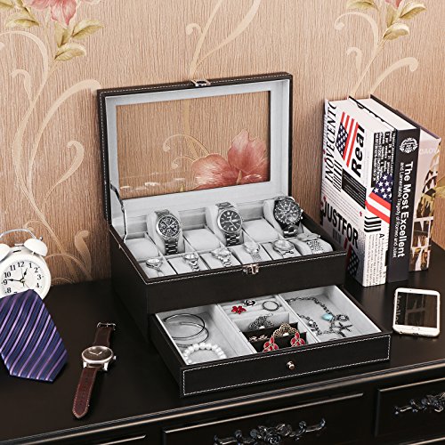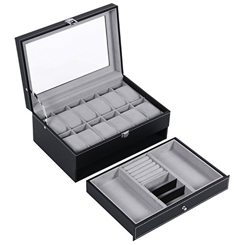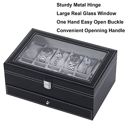 -. Title : BEWISHOME Watch Box Case Display 12 Men Watch Organizer Jewelry Box Tray Drawer Black PU Leather Glass Top SSH02B
