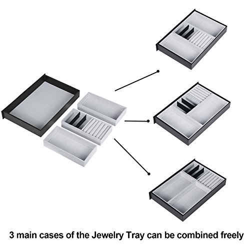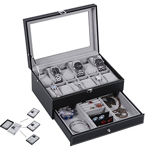 -. Feature : HIGH QUALITY AND FANTASTIC LOOK: Made from Black PU Leather, MDF and Velvet interior & pillows, this Glass Top Watch Display Box with Jewelry Tray will stand out wherever you place it for its chic and fabulous design / DOUBLE LAYER DESIGN: The first layer offers 12 watch slots with removable velvet pillows. The second layer is a jewelry tray which offers enough compartments for cuff links, rings, earrings, bracelets, brooches and necklaces and other jewelry / MULTI-FUNCTIONAL SHOWCASE: All the pillows on the first layer can be removed so that you can use it as a jewelry box if you are desired. The 3 main cases on the second layer can be combined freely to meet your request / LARGE STYLISH REAL GLASS LID: Clear glass top protects your watch from dust and scratches, offers you a clear and easy open view so that you can find your favorite treasure in seconds / Great GIFT IDEA: With elegant appearance and considerate design, this Watch Box is great for personal use, shop display and home decoration. It is the best gift for a father, a mother, girlfriend, wife, daughter, colleague, friend or any other special person in your life
