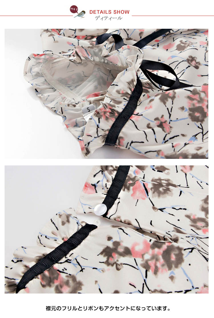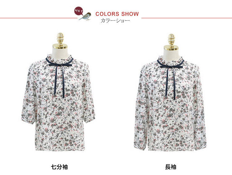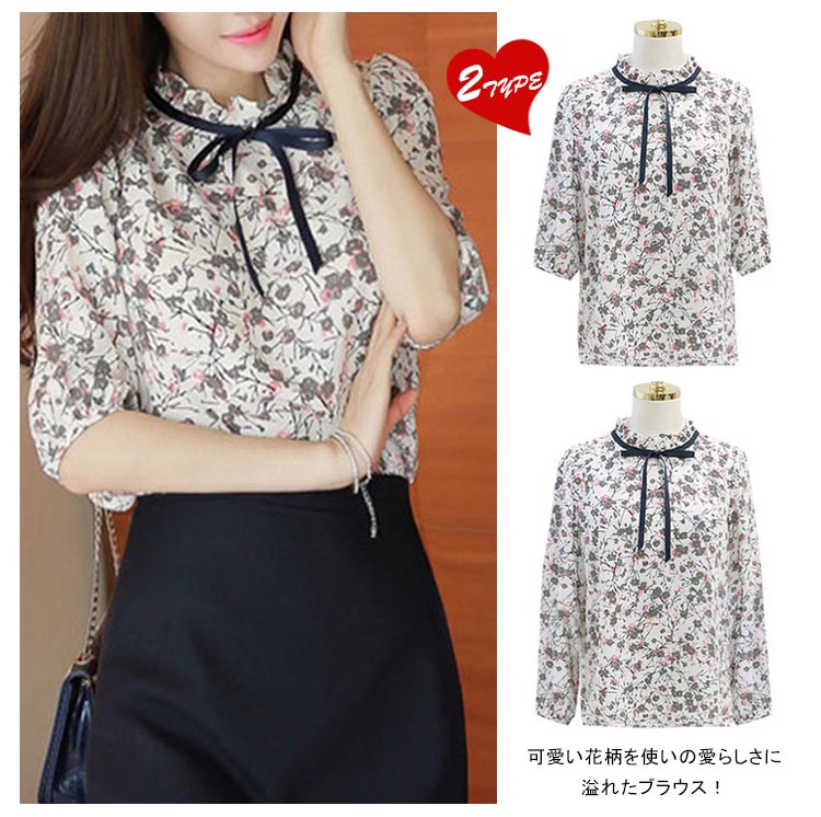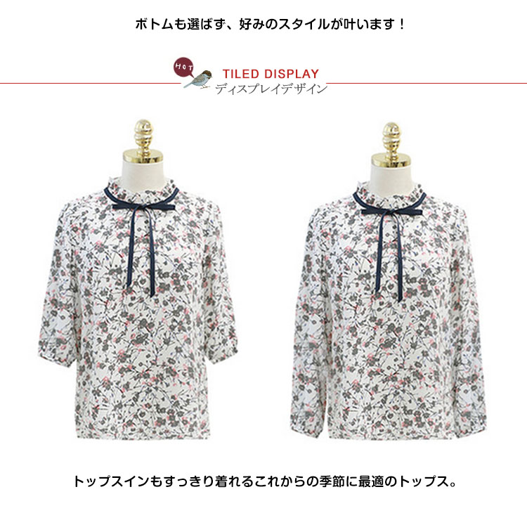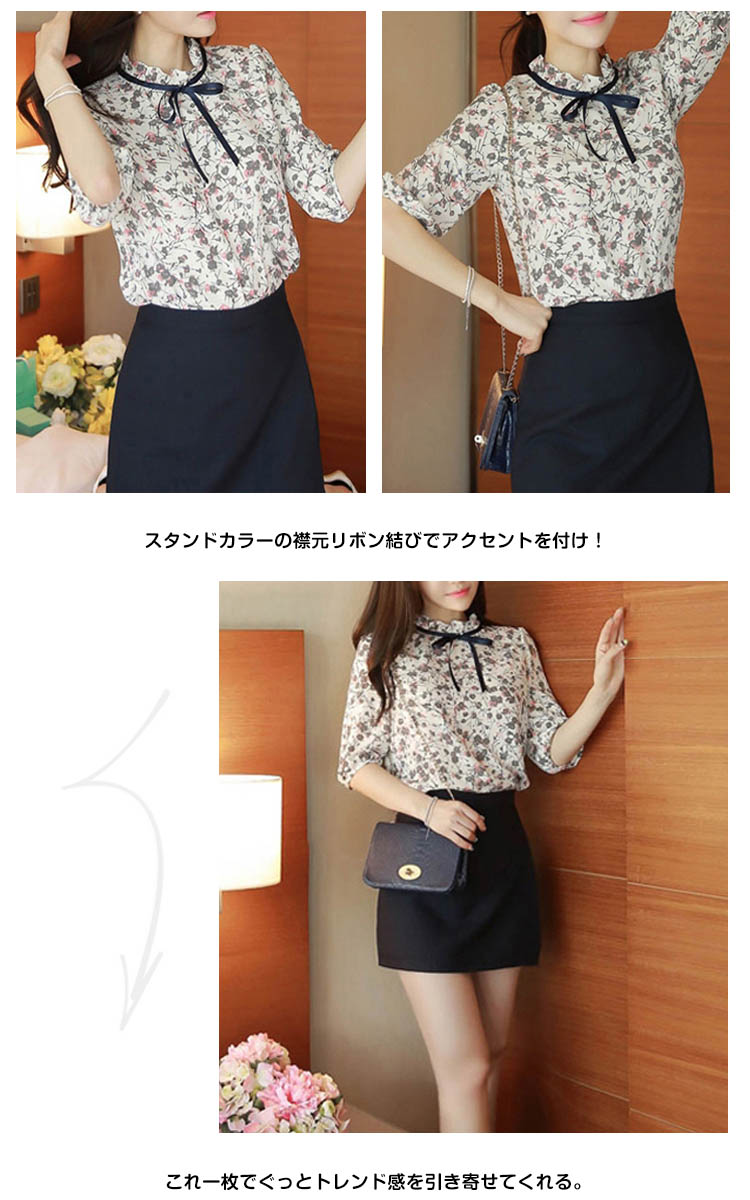 | 可愛い花柄を使いの愛らしさに溢れたブラウス!スタンドカラーの襟元リボン結びでアクセントを付け!これ一枚でぐっとトレンド感を引き寄せてくれる。さらっとした生地と小花柄が上品な大人マストアイテム。ボトムも選ばず、好みのスタイルが叶います!トップスインもすっきり着れるこれからの季節に最適のトップス。 | |