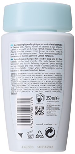 -. Binding : Health and Beauty -. Brand : Kerastase -. Department : womens -. EAN : 3474635001751 -. Feature : 8.5 ounce shampoo / Dermo-calm bain riche haute tolerance shampoo was launched by the design house of Kerastase / It is recommended for normal skin -. IsAdultProduct : 0 -. Label : Kerastase -. LegalDisclaimer : Please be aware that unless expressly indicated otherwise, product packaging may vary from what is shown on this listing. We recommend that you do not rely solely on the information presented on our listing. Please always read the labels, warning and directions provided before using or consuming the product. -. Manufacturer : Kerastase -. Model : 250030 -. NumberOfItems : 1 -. PackageQuantity : 1 -. ProductGroup : Beauty -. ProductTypeName : ABIS_DRUGSTORE -. PublicationDate : 2013-04-12 -. Publisher : Kerastase -. Size : 8.5 oz. -. Studio : Kerastase -. Title : Kerastase Dermo-Calm Bain Riche Haute Tolerance Shampoo for Unisex, 8.5 Ounce -. UPC : 721866514400