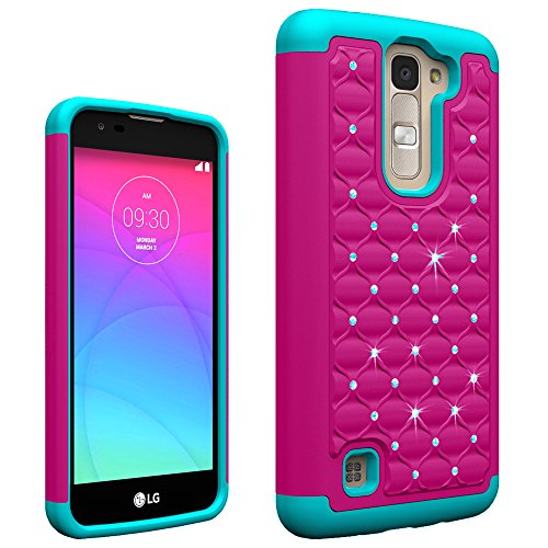 Deego LG Tribute 5 Case, LG K7 Case, 2 in 1 Bling Rhinestone Diamond Design Durable Hybrid PC + Silicone Bumper Slim Defend Full Hard Back Cover Case (Hot Pink+Teal)