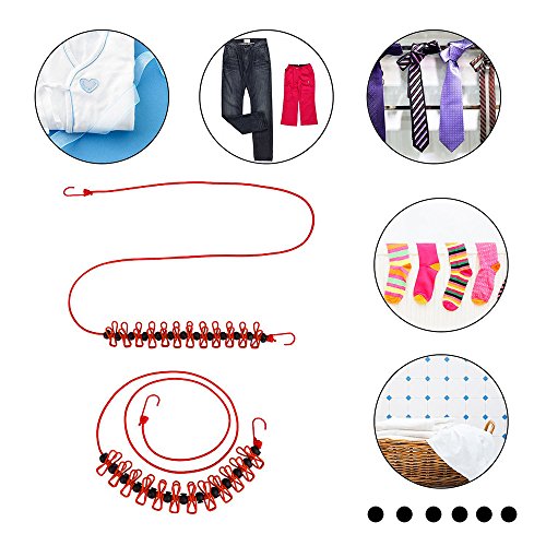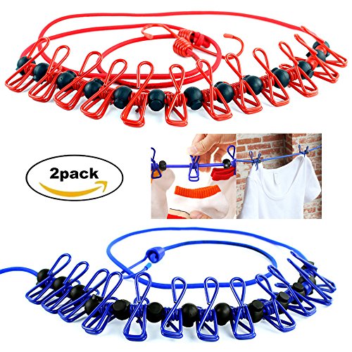 Portable Clothesline Perfect for Camping Hiking Beach Trips & Home Use Travel Clothes Line Rope with 12 Clips Elastic Windproof and Positioning (Blue+Red)