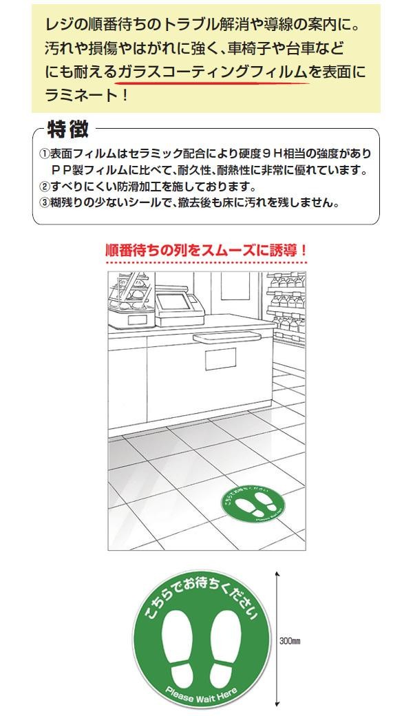 | ガラスコーティングフィルムを表面にラミネートした、耐久性抜群のフロア誘導シールです。コンビニ・ドラッグストアなど、屋内の行列のできるあらゆる場所でお使いいただけます。長期に渡って使用感を感じさせず、店舗の美観を保てます(想定期間は通常使用で約2年の目安)。光沢があるタイプなので、視認性にも優れています。 |