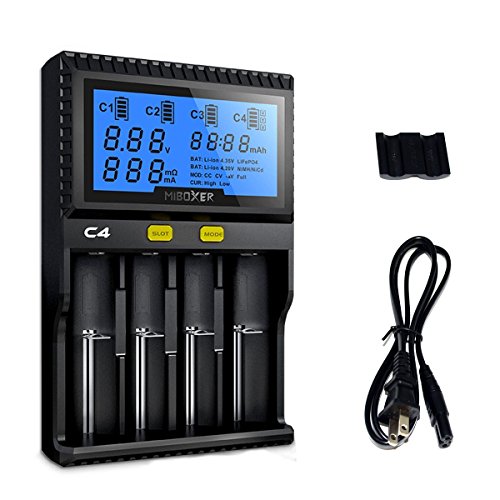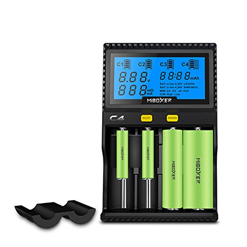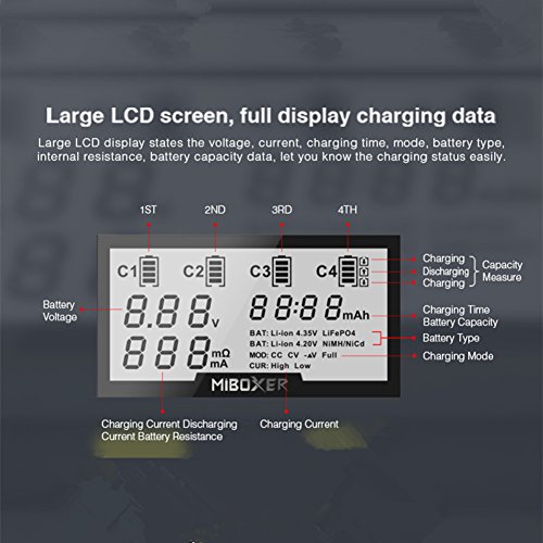 - [High Efficiency]: 4 charging slots can charge different kinds of batteries at the same time, each charging slot load max 800mA. Large LCD display states the voltage, current, charging time, mode, battery type, internal resistance,battery capacity data.