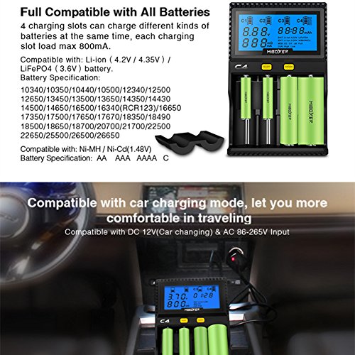 - [Fully compatible,One is enough]:Compatible with: Li-ion(4.2V / 4.35V)/ LiFePO4(3.6V)battery. 10340/10350/10440/10500/12340/12500/12650/13450/13500 13650/14350/14430/14500/14650/16500/16340(RCR123) 16650/17350/17500/17650/17670/18350/18490/18500/18650 18700/20700/21700/22500/22650/25500/26500/26650 Ni-MH / Ni-Cd(1.48V) AA AAA AAAA C with DC 12V(Car changing) & AC 86-265V Input