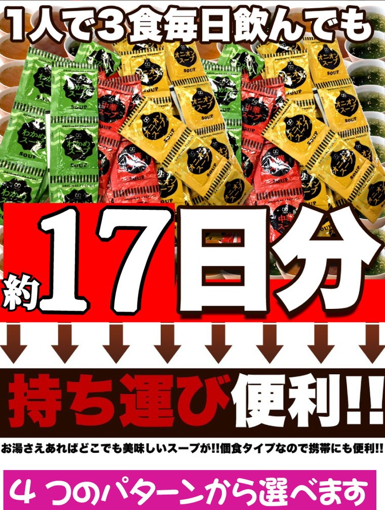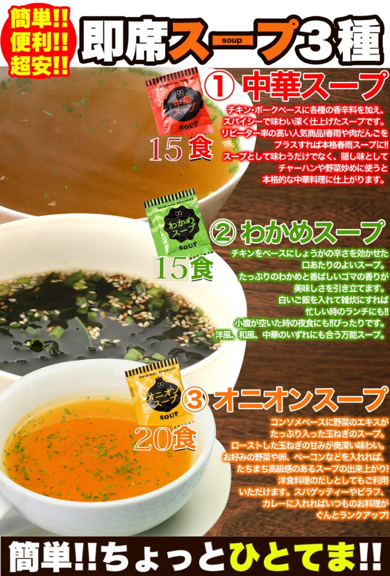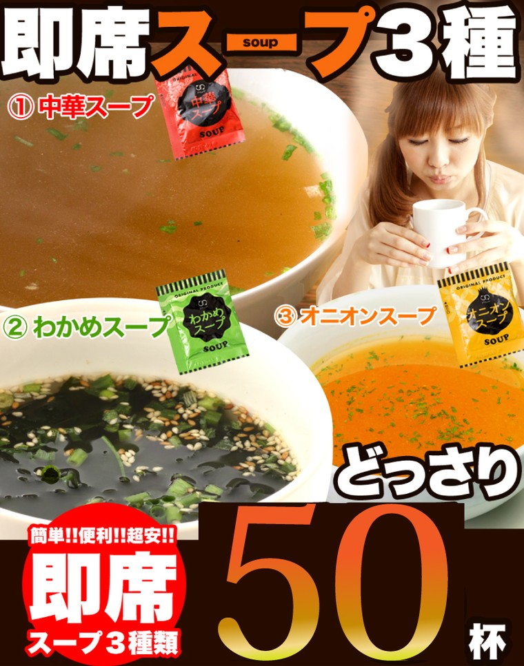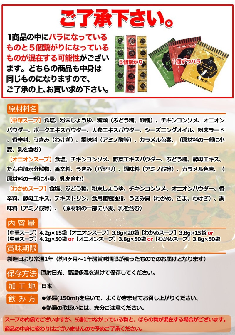 即席スープ 選べる4パターン 50食入り・オニオン/わかめ/中華/お吸い物(1)いろいろな味を楽しみたい方に♪・中華スープ 15食・オニオンスープ 20食・わかめスープ 15食(2)中華50食(3)わかめ50食(4)オニオン50食よりお選び頂けます!■美味しいスープでほっと一息。\持ち運び便利!使い切りで便利/お湯を注げばすぐできる!OLの皆さま、主婦の皆様、一人暮らしの皆様などなど寒い季節に超便利です。職場にもっていきお昼のもう一品に、時間のない朝食に、寒い季節に暖まりたい時。どんなシチュエーションでも便利にお使い頂けます。●熱湯(150ml)を注いで、よくかきまぜてお召し上がりください。●熱湯の取扱いには、充分ご注意ください。