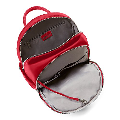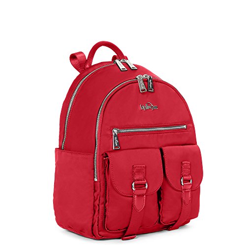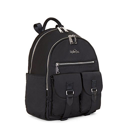 -. Feature : Polyester / Adjustable backpack straps / Front zipper pocket / Two front pouch pockets with snap closure / Two main zipper compartments