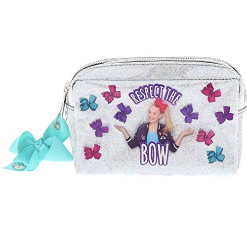 JoJo Siwa Make-Up Cosmetic Bag Pouch with Mirror - Silver Iridescent Glitter with Pink, Blue, and Purple Bows - Respect the Bow