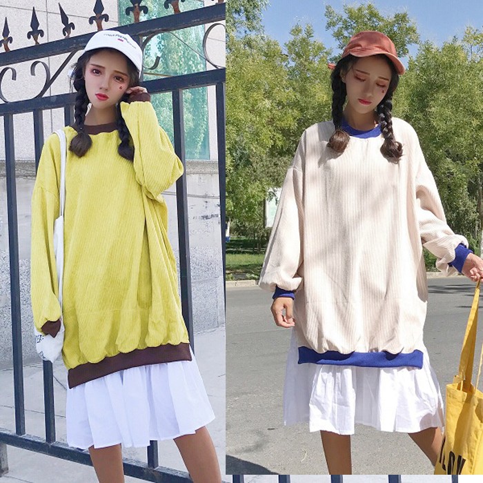 ゆるっとしたコーデュロイのロングトップスとフワッとしたスカートの