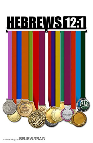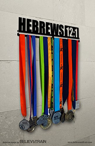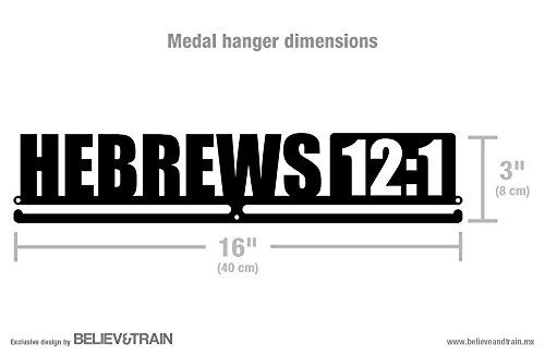 -. Binding : Misc. -. Brand : Believe&Train -. Color : Black -. EAN : 0099461320253 -. Feature : Unique design with motivational message to proudly display medals / Made of light weight high grade aluminum. Holds 16-20 medals** / Extension kits available to add more medals (sold separately) / Slide medals to display / Easy to install. Includes complete wall mounting kit -. IsAutographed : 0 -. IsMemorabilia : 0 -. Label : Alveni -. LegalDisclaimer : *Does not include tools nor medals. **Number of medals may vary according to ribbons width. It ships to USA except AK/HI/Puerto Rico. Most orders are shipped within 2-3 days from the purchase date. -. Manufacturer : Alveni -. MPN : MHH12UBK11 -. PackageQuantity : 1 -. PartNumber : MHH12UBK11 -. ProductGroup : Sports -. ProductTypeName : SPORTING_GOODS -. Publisher : Alveni -. Size : 3" x 16" (40 cm x 8 cm) -. Studio : Alveni -. Title : Motivational Medal Hanger - Hebrews 12:1 -. UPC : 099461320253