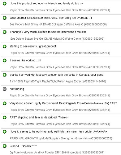ModelSupplies Rapid BrowTM Growth Formula! ~ This listing is for 1 bottle ~ The Original ~Since 2003~ Accept No Substitutes~! NOW WITH Biotin, Horsetail Extract, Black Castor Oil & Copper Peptides~! The formula is now almost tan~! Rapid Brow has worked since 2003, but we keep improving it~!!! Regrow overplucked brows! Encourage growth of new brows! I formulated this product after slipping with the hot wax and pulling off half my eyebrow! (I have plucked each individual hair ever since.) I was horrified, because your eyebrows really make or break your look. In acting, you learn that your eyebrows are KEY to conveying emotions (or not conveying). In modeling and makeup artistry, special attention is given to eyebrows to shape the face, emotion and theme of the show. If your eyebrows look good, you are more than half the way there! This formula is an oily lotion that should be applied only where you want the hair to grow and in a very thin coating. There have been a few cases where it did not work on people. Like any product, nothing works 100% of the time on 100% of the people - (not even Min0xidil), but the success rate of Rapid BrowTM has been amazing~! JUST "PAINT" IT ON AT NIGHT Results usually reported in 3-8 days, but can take up to 1 month or longer, stick with it and be patient. We have many repeat customers for this product. Rapid BrowTM has even grown hair where none has grown before in some individuals~! It also has worked on facial hair for men~! Contains ingredients to reach and stimulate the hair follicles, clear congestion and seal for warmth to encourage faster hair growth. Apply to Eyebrows only each night before bed - no eyelashes, please! Patent Pending. If you have been using Rapid BrowTM for 2 weeks and see no results, keep trying! Especially if you have never grown hair in that spot or using to thicken your brows. Those results can take up to 30 days, but it does actually work!Feature