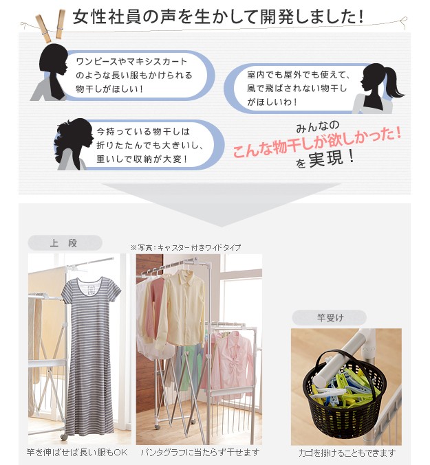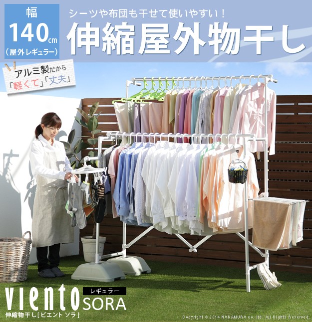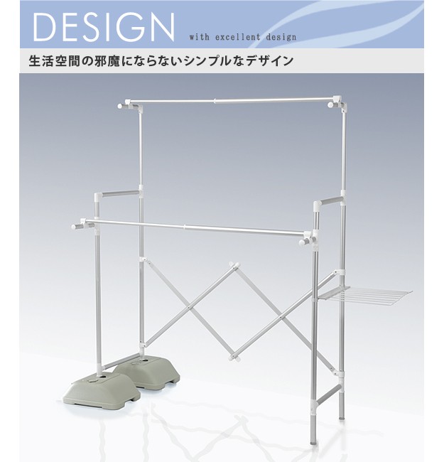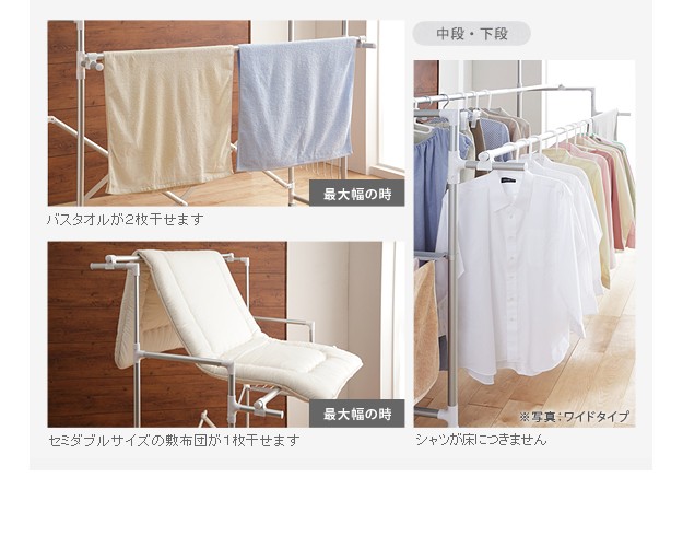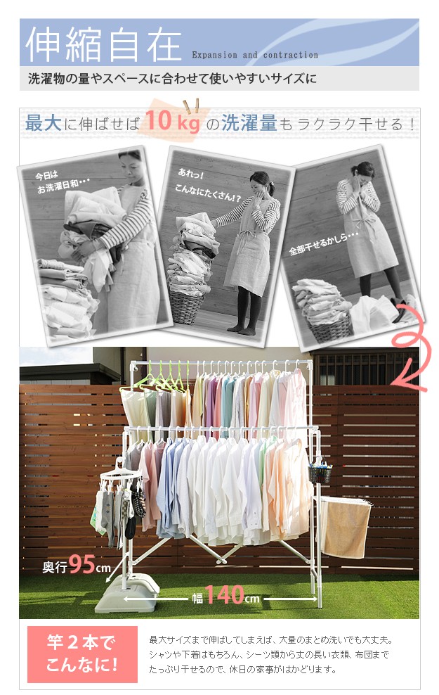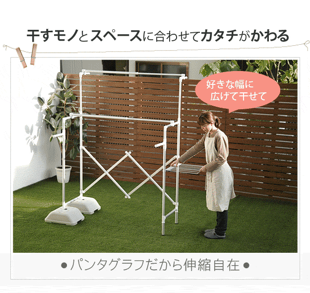 場所や洗濯物の量に合わせて幅も高さも伸縮自在!スペースを無駄なく活用できるアルミ伸縮物干し(レギュラー)。ベランダなど屋外でも倒れにくいベース付きです。丈夫でサビにくいアルミ製。最大サイズまで伸ばして使えば、大きな洗濯物までしっかり干せます。軽いのでサイズ調整や収納もラクラク♪コンパクトにたためば収納場所をとりません。ベースを取り外して室内使用もOK!花粉や梅雨の季節も安心です☆サイド(片側)には便利なタオル掛けが付いています。