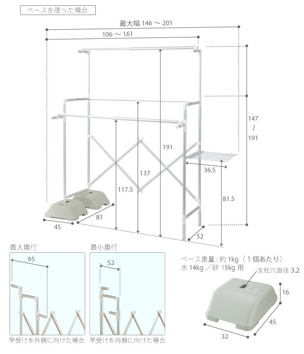 ベース使用時サイズ:幅106~161x奥行81x高さ147~191cm