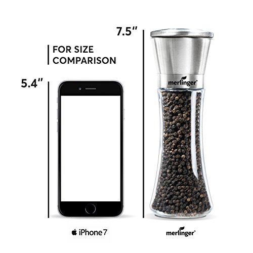 Premium Stainless Steel Salt and Pepper Grinder Set of 2- Brushed Stainless Steel Pepper Mill and Salt Mill, 6 Oz Glass Tall Body, Multi-grade Adjustable Rotor, Salt and Pepper Shakers By Merlinger