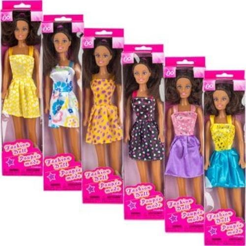 Lovely plastic dolls have a keen fashion sense! Dolls have plastic bodies with movable arms, legs, and heads and come in an assortment of stylish dresses. Perfect for hours of make-believe fun, these dolls are also great for care packages, prize boxes, and resale. Case includes 6 - 11½" African-American Fashion Dolls assorted among dolls with 6 different outfits. Ages 3+.Feature