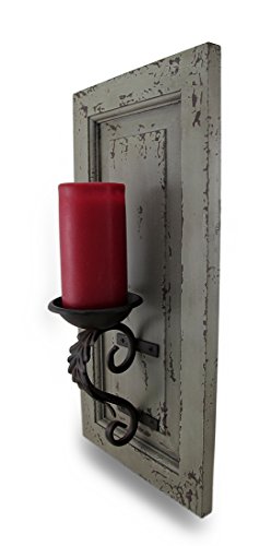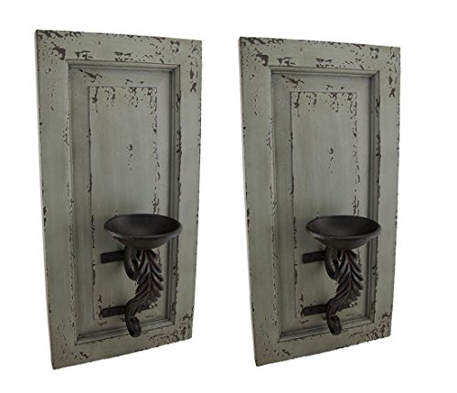 Studio : Zeckos Publisher : Zeckos Binding : Kitchen Product Description Everything seems more beautiful in the soft golden glow of a candle! Ready to light up any evening, this set of elegant institutional gray distressed finish wall sconces adds a hint of romantic lighting to any room. It's crafted of wood with a distressed painted finish for a vintage vibe, and features a metal leafy scroll holder that accommodates candles up to 3.25 inches diameter (not included). Each piece easily installs using the pre-attached keyhole hangers on the back. Whether in the bedroom, bath, dining room or on a sheltered porch, the flicker of your favorite candles makes this 19 x 9.5 x 4.5 inch set complete. 0