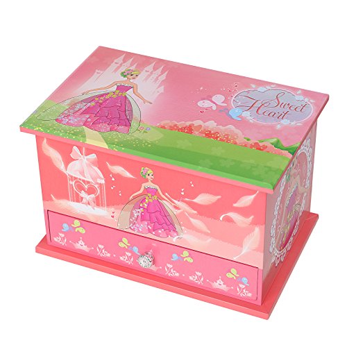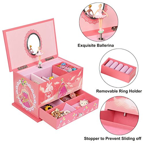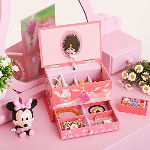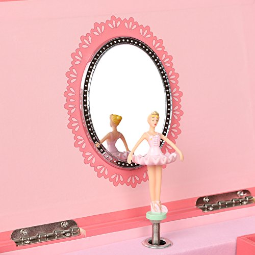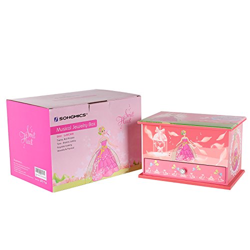 SONGMICS jewelry music box features selected materials and exquisite craftsmanship, aiming to provide elegant and practical musical jewelry storage case, and bring happiness for little girls.Decorated with sweet ball princess, magic castle and pretty flowers pattern, this beautiful pink musical jewelry box perfectly matches kids' interests. Simply open the lid of the ballerina music box, and wind up the clockwork mechanism at the back of the box to reveal a delicate ballerina figurine twirling to the enchanted tune of "Brahms Lullaby". And it is lined with soft flocked fabric to protect your jewelry collection. The jewelry storage box includes 11 compartments and 1 removable ring holder, excellent for storing girl's jewelry like rings, earrings, bracelets, necklaces, cufflinks, hairpins etc. And music will stop automatically when you shut the lid. With these classic designs: delicate ballerina, enchanted music, roomy compartments, hinged top, elegant oval mirror, the jewelry box is not only lovely but also functional, and will be a wonderful gift for daughter, sister or friends.