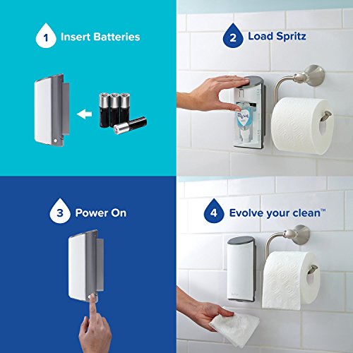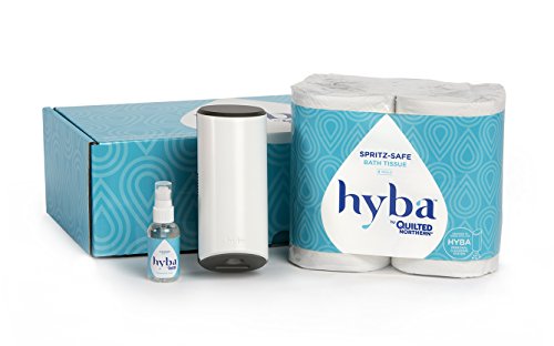 The Hyba Starter Kit includes 4 rolls of Spritz-Safe Toilet Paper, 1 bottle of Cleansing Spritz, 1 Touchless Dispenser, and 1 stainless steel stand. You can also purchase the Spritz-Free Bath Tissue and Cleansing Spritz refills