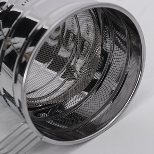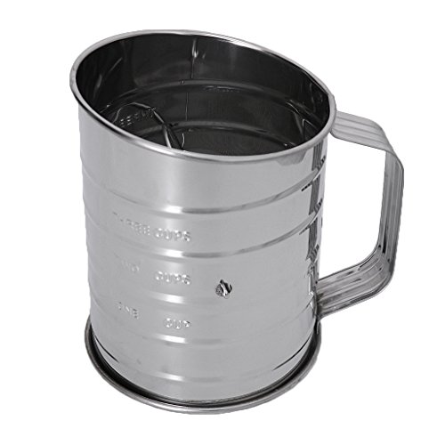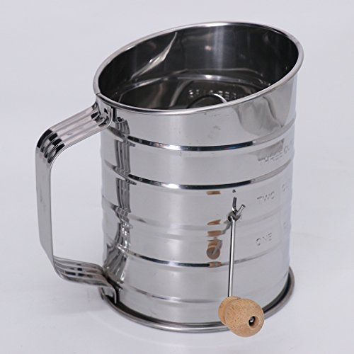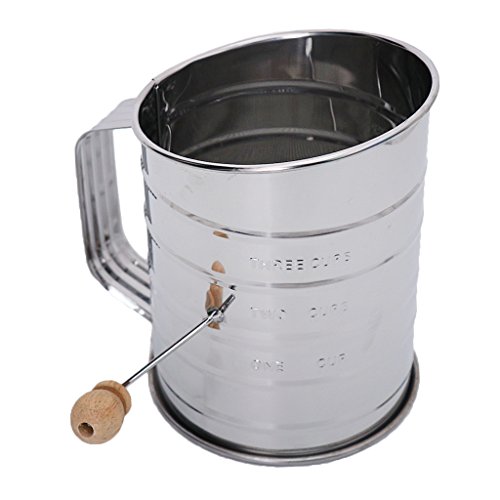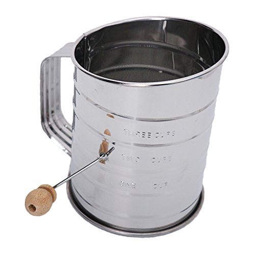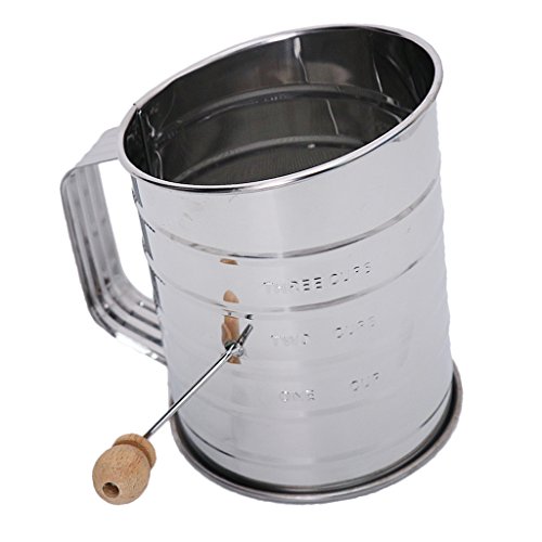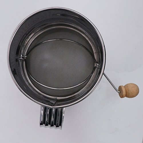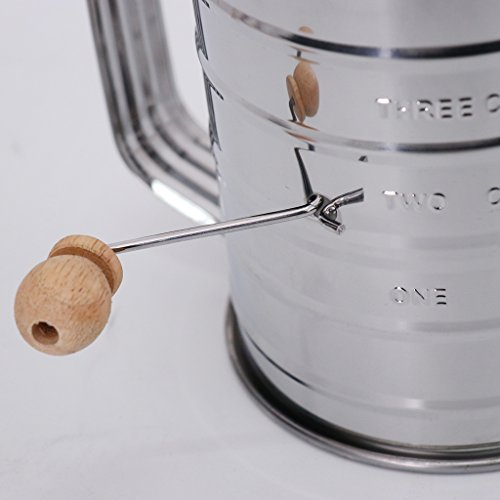 Description: - Stainless steel hand crank rotary flour sifter with scale , durable and convenient. - The special design of hoder to keep flour and not be afraid to spit out.