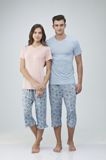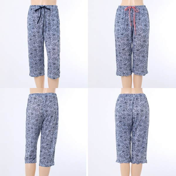 남녀가 같은 프린트로 7부 기장에 밑단에 프릴이 있어 경쾌하며 일자 바지로 주머니가 있어 편리하며 배색원단 허리끈이 있는 제품.