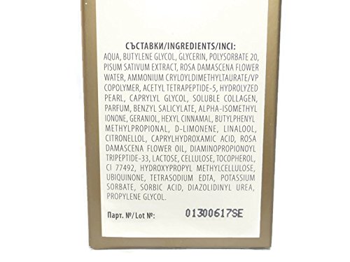 Organic rose oil, organic rose water, black pearl extract, peas extract, collagen