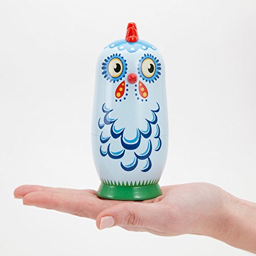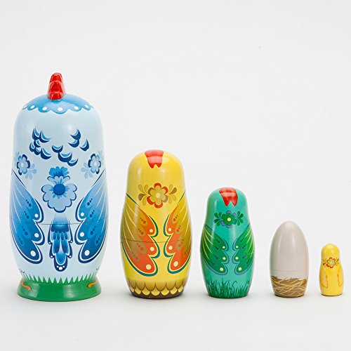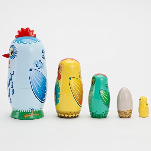 Product Description Our blue feathered friend with a bright red crest has two colorful chickens, an egg and a baby chick nesting inside her. Printed and hand painted wood. Set of 5. Largest measures 5-1/2" tall. 0