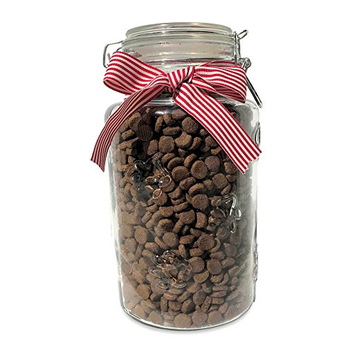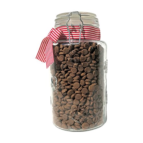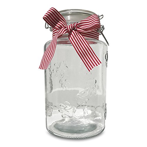 - THE ICONIC CLEAR GLASS KITCHEN STORAGE JAR FOR DOG BISCUITS brings gorgeous vintage style together with high quality clear glass construction that is ideal for everyday use. Full of rustic character and detailed with a repeating paw pattern plus a cheerful red and white striped ribbon, this handy jar is perfect for storing dog treats in style.