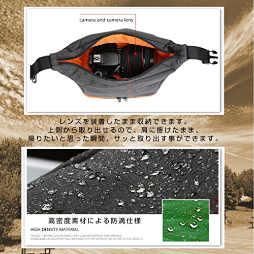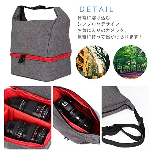 -. Feature : コンパクトなのに大容量なカメラバッグです。カジュアルなデザインで、気軽に持って出かけられます! / 上部には、レンズを付けた状態の一眼レフカメラを収納することができます。 / バッグを肩に掛けたまま→カメラのストラップを首にかける→そのまま取り出してすぐに撮影!カメラを落とす心配もありません! / 下部の面積が広い為、床に置いた状態でも安定しています。 / 下部のファスナーを開ければ、レンズが2本程度収納できます。仕切りは自由に配置できますので、小物などのサイズに合わせてご活用ください!