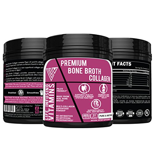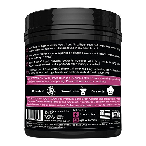 -. Title : LIV Premium Bone Broth Collagen, 15g per servings of 100% Pure All-Natural Type 1, 2 & 3 Collagen and Bone Broth Co-factors, 31 Servings of Paleo friendly Multi-Collagen Superfood, Made in USA
