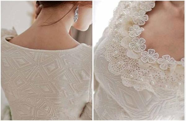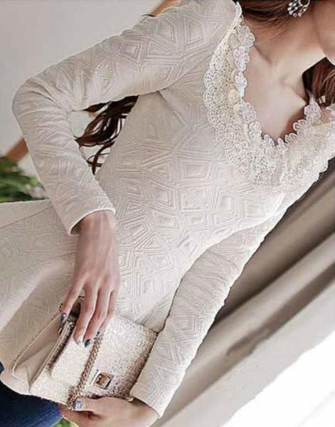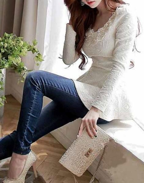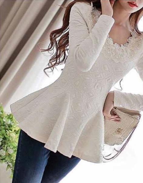 エレガント 花柄裾レース 長袖シャツ ブラウス ペプラムトップス 白