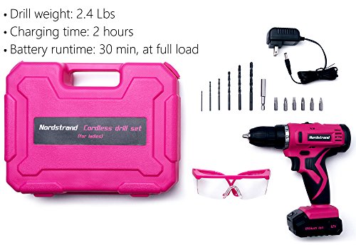 - DESIGNED FOR WOMEN Only 2.4lb and with a soft, comfortable grip, the Nordstrand Cordless Drill is designed for smaller, slighter people. The set packs away into bright pink carry case which makes the whole kit easy to take wherever you need to go.