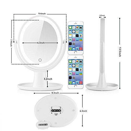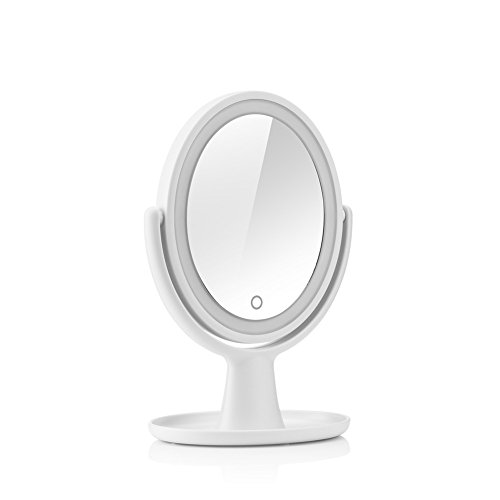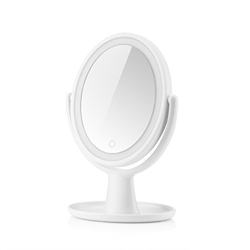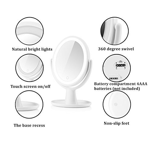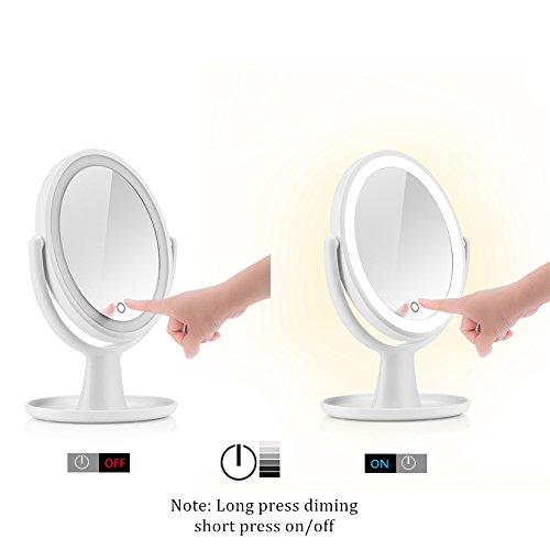 - ENJOY NATURAL, BRIGHT & SOFT LIGHTING: This makeup mirror illuminated with new-graded 18 LED lights which is more natural, bright, soft and long-lasting for your flawless makeup or skincare. Controlled by touch sensor switch on the mirror, turning LED lights on/off & adjust the brightness by simply holding down the touch sensor to dim or brighten the lights to meet your beauty needs. Humanized-switch design allows for convenient use.