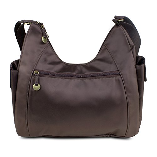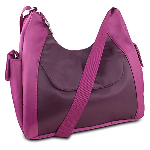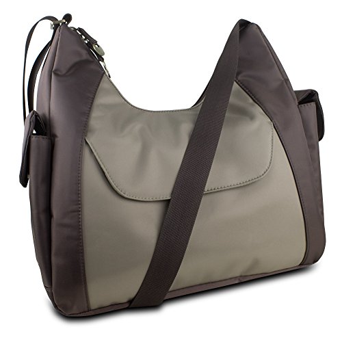 You always want to protect your identity everywhere you go so do it with the Travel on Oversized Everyday Hobo Style Bag w RFID Protection. Important documents such as your passport credit cards key cards and drivers license all contain RFID chips that broadcast your personal information. This bag blocks the transmission of this information preventing unauthorized access by others. It features a large main compartment with plenty of room for all your essentials plus 5 cards slots two slip pockets and interior zippered pocket for organization. Theres also two larger pockets on the front and back plus two side pockets for other odds and ends. The shoulder strap is easily adjustable so you can wear the bag as a shoulder bag or cross-body bag.Features. Perfect bag for all of your everyday needs even while traveling. Features RFID-blocking to keep your private information safe everywhere you go. Large main compartment has plenty of room for your essentials with 5 card slots two slip pockets and an interior zippered pocket. Includes rear zippered pocket and front magnetic pocket for odds and ends you need frequently. Two side pockets with snap closures provide the perfect places for sunglasses gum mints and more. Adjustable strap easily converts the bag from a shoulder bag to a cross-body bagIncludes. Hobo Bag. Detachable LED LightSpecifications. Exterior Color Brown-Taupe. Interior Color Creamsicle Orange. Strap Drop Middle of Strap to Top of Bag Adjustable from 18 to 33 in.ApproxFeature