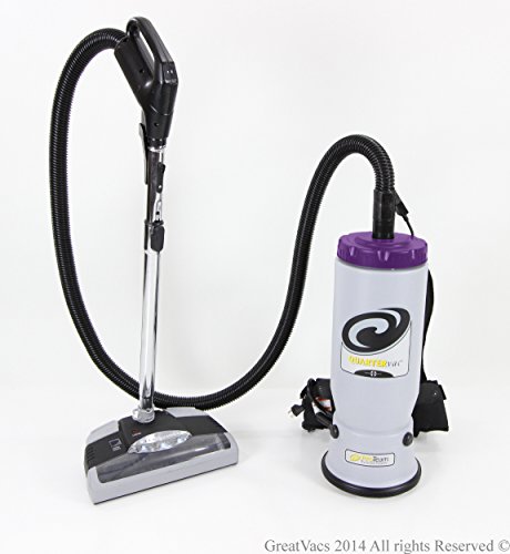 This is the Brand New Fully Loaded New ProTeam Super QuarterVac backpack vacuum with the GV PRO KIT attachment set, which includes a durable and powerful GV electrical power nozzle / head. This power nozzle has 6 levels of height adjustment, on/off switch, LED Lights, reset, rubber bumper to protect walls and viewing window so you can keep brush roll clean. The height adjustment allows you to easily transition from any hard floor surface to the thickest carpet. Led lights take low amount of power and are long lasting. Reset switch ensures longevity of your head by turning the motor off if the head becomes overworked or clogged. The Super QuarterVac pro kit includes: GV power head with powerful brushroll, adjustable extension wand, 50 ft. cord, 10 bags, Multi surface Floor tool with retractable brushes, Crevice, Duster and Upholstery tool. The QV vacuum uses 3 filters to protect the motor from grease and dirt. Its rugged design and redesigned shape make for a more comfortable fit on your back and make it a perfect match for the tough demands of food services, office buildings, schools, hospitals, churches and movie theaters. These vacuums are ideal for cleaning commercial-grade carpeting, hard floors, chairs, sofas, blinds, stairs, and reaching up to clean heat and air conditioning vents as well as over door and window trim. Specifications: Watts: 1188-Watt / Weight: 10 lbs. / Decibels: 67 dBA / Airflow: 150 CFM / Static Lift: 100 in. / Amps: 9.9 Amp.