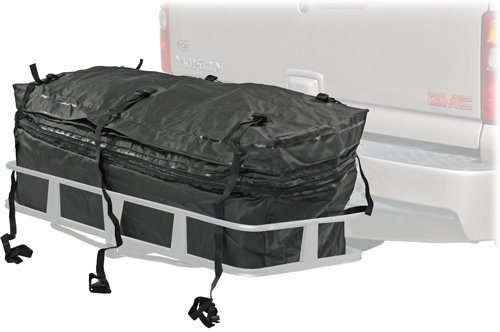 Soft-sided flexible cargo storage area, great as a roof bag or a cargo carrier bag, expands from 17" to 21"H Fits 48" hitch mounted cargo carrier baskets and cargo trays (6) Integrated tie-down straps (2) Interior 16" x 8" zippered pockets Waterproof PVC coated nylon material with weather-seal zipper flapFeature