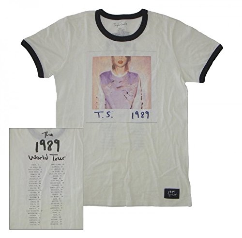 -. Binding : Apparel -. Brand : Taylor Swift -. Color : White -. Department : womens -. Feature : Natural colored tee with black neckline and sleeves. Features the 1989 Album Cover with tour cities on the back. / This tee runs VERY small. / Please refer to size chart before selecting size. / Unisex sizing / 100% Cotton -. ProductGroup : Apparel -. ProductTypeName : SHIRT -. Title : Taylor Swift 1989 Album Cover Tour Ringer Tee T-Shirt Small, Medium, Large
