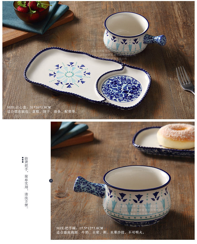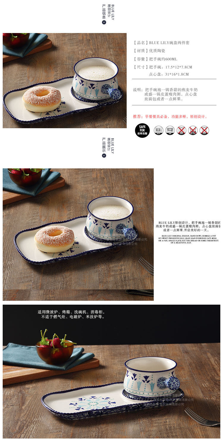 蓝百合创意釉下彩陶瓷早餐碗带手柄燕麦牛奶锅泡面碗早餐托盘