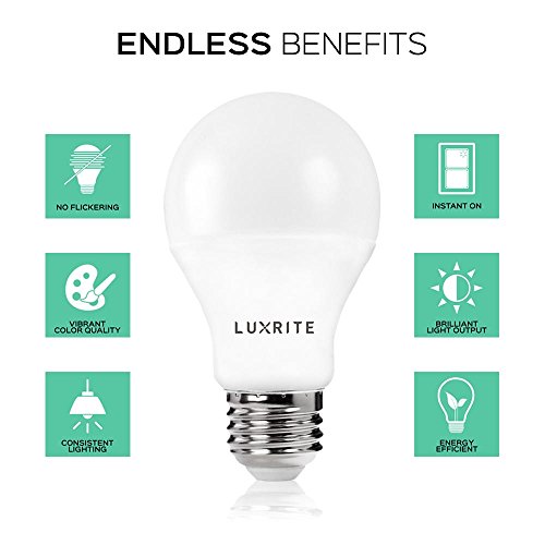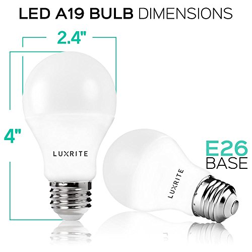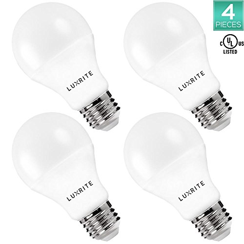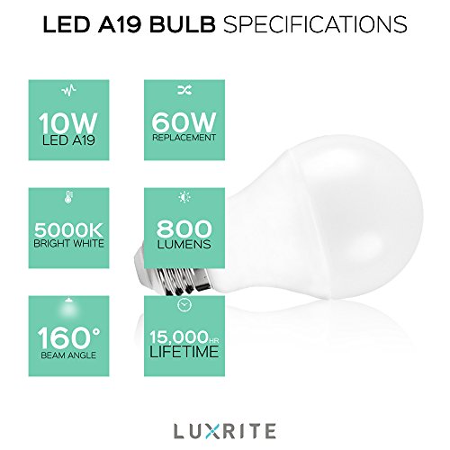 Pack of 4 LED A19 Bulb, Luxrite, 60W Equivalent, Non-Dimmable, 5000K Bright White, 800 Lumens, 60 Watt Light Bulb, E26 Base, UL Listed
