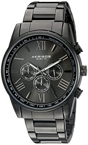 -. Binding : Watch -. Brand : Akribos XXIV -. Color : Grey -. Department : mens -. EAN : 0848572038621 -. Feature : Radiant dark gray sunburst dial featuring three hand movement, two time zone, tachymeter scale with day and date subdials / Individually hand applied silver tone roman numerals and stick index with luminescent filled silver tone baton style hour and minute hands / Black ion plated alloy case with black polished link bracelet / Quartz movement with analog display / Water-resistant to 10 M (30 feet) -. IsAdultProduct : 0 -. Label : Akribos XXIV -. Manufacturer : Akribos XXIV -. Model : AK736BK -. MPN : AK736BK -. PackageQuantity : 1 -. PartNumber : AK736BK -. ProductGroup : Watch -. ProductTypeName : WATCH -. Publisher : Akribos XXIV -. ReleaseDate : 2014-05-09 -. Studio : Akribos XXIV -. Title : Akribos XXIV Men's AK736BK Round Dark Gray Dial Three Hand Quartz Black Bracelet Watch -. UPC : 848572038621