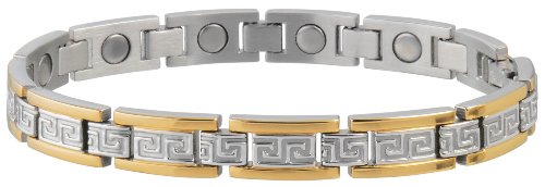 Product DescriptionBrushed stainless steel with 18k gold plating featuring the popular Greek key design with each link a 1200 gauss magnet.0