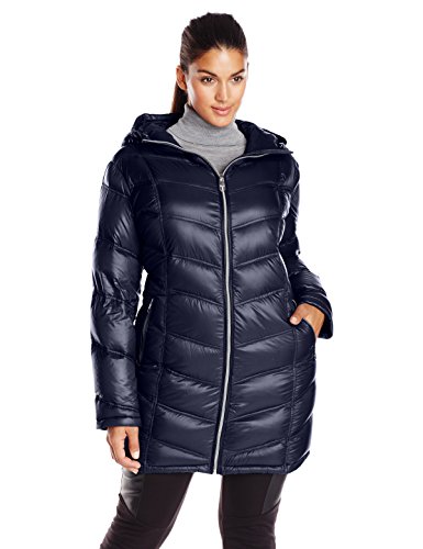 Hooded down coat featuring chevron quilting, smocked back, and side-zip pockets
