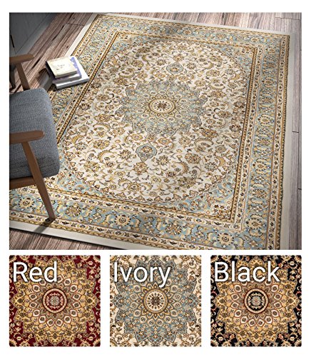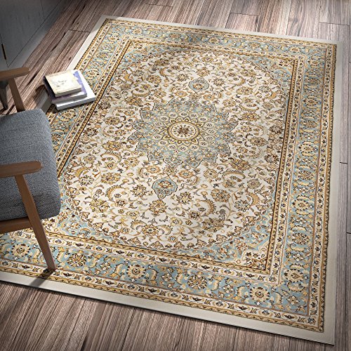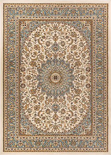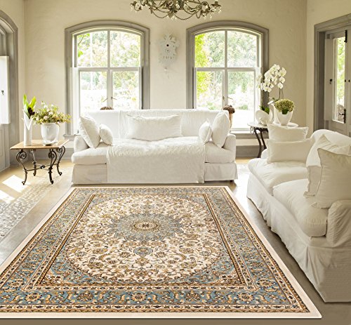 Sultan Medallion Ivory / Blue is a traditional rug for the modern home. With a classic yet trendy Persian Oriental medallion design and a multi color palette of warm, jewel tone colors. A plush 0.5" pile of heat polypropylene lends an exceptionally soft hand. This yarn is stain resistant, and doesn't shed or fade over time. The 100% jute backing is safe for wood floors and all four sides of the rug are serged for improved durability. Perfectly suited for the luxurious yet active lifestyle and built to last for years.Feature