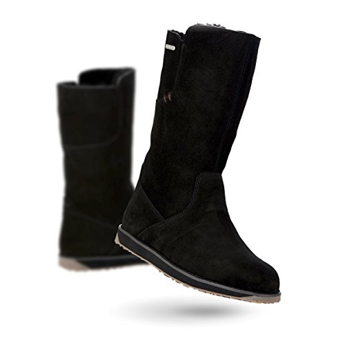 Breathable waterproof membrane with sealed seams between suede and sheepskin.