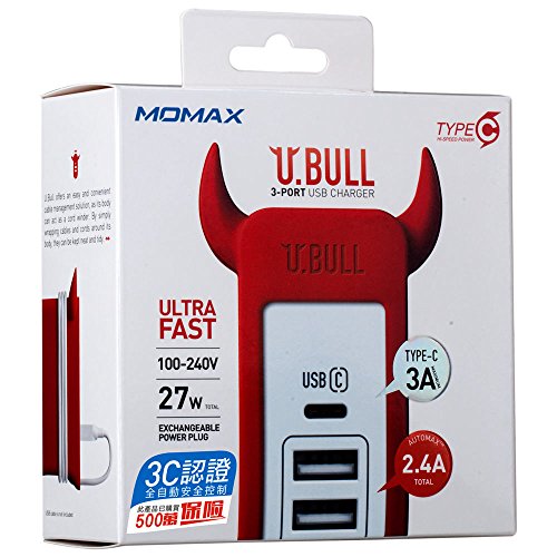 MOMAX USB C Quick Charger, Ultra Fast 3 Port 27W USB Wall Charger with 5V 3A Type-C Port and AutoMax Technology for Galaxy S7 / Edge / Plus, LG, Nexus, HTC and More (Red)