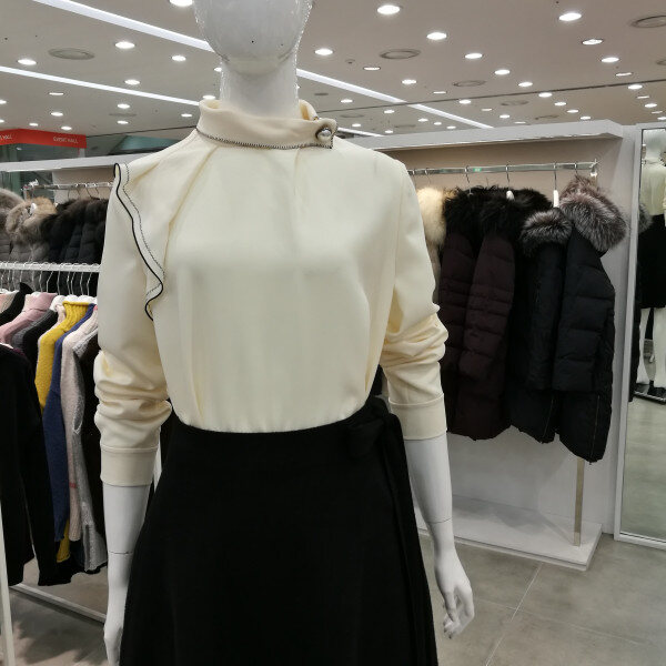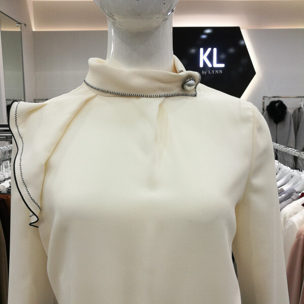 한쪽어깨에 프릴이 달려있어 여성스럽고 차이나카라로 진주장식이 달려있다. 이너로 입기 너무좋다.
