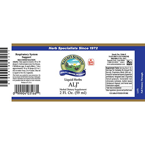 -. Binding : Health and Beauty -. Brand : Nature's Sunshine -. Feature : How It Works: Airborne particles are everywhere. When particles enter the respiratory system via the nose or the mouth, the body turns on its cleansing mechanisms, and the immune system is put on active duty. / Assists the body in neutralizing allergens by nutritional means. / Provides effective respiratory system support. / Helps soothe irritated tissues. / Encourages the entire respiratory tract to gently cleanse itself. -. ProductGroup : Health and Beauty -. ProductTypeName : HEALTH_PERSONAL_CARE -. Title : Naturessunshine ALJ Liquid Supports Respiratory System Liquid Herbs