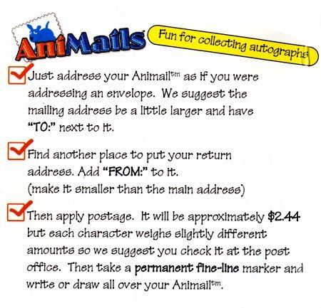 -. Feature : MAIL-ABLE: Show Someone You Care; Use as Invites, Collect Autographs; Possibilities are endless with our Unique Write- on, MAIL-ABLE AniMails. Send a message to last a lifetime. / DURABLE: AniMails are made with strong, durable material that can endure the abuse of the mailing system. Using a permanent marker assures lasting sentiments that can be collected and displayed. / HOW IT WORKS: Address your AniMails with "TO:" and "FROM:" addresses. Apply postage. Take a permanent fine-lined marker be artistic or just silly writing all over your AniMails. / FUN AND UNIQUE: AniMails makes mailing a message, sending invites, collecting autographs for a teacher memorable. Picture your personal sentiments displayed on the shelf for all the world to see. / INCLUDES: 1- AniMails Mini Wahoo - Blue. Be creative and have fun showing someone you care with AniMails the Low tech message of love that will last a lifetime.