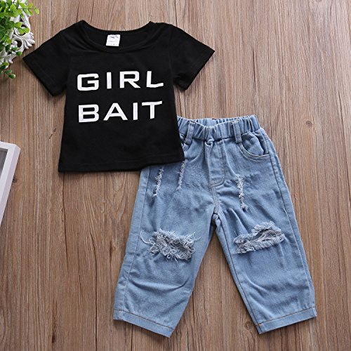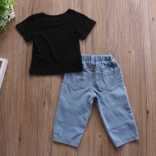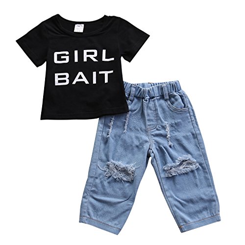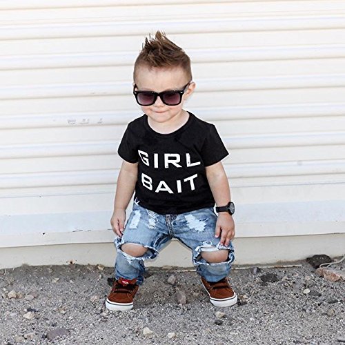 -. Binding : Apparel -. Brand : Mrs.Baker'Home -. Department : baby-boys -. Feature : ❀Superior in material and excellent in workmanship. NO other chemicals are added to the fabric / ❀Suitable for toddler boys about 1-6 Years .Material:Cotton + Denim with Pockets. Color:Black / ❀High quality material offers comfortable wearing effect for baby's tender skin / ❀Matched pants with high elastic waist for a flexible and comfy fit / ❀Adorable outfits for play,visting,church,at home and school -. ProductGroup : Apparel -. ProductTypeName : PANTS -. Title : Toddler Kids Baby Boys Letter P.R.Int T-shirt+Ripped Denim Jeans Holes Long Pants Outfit