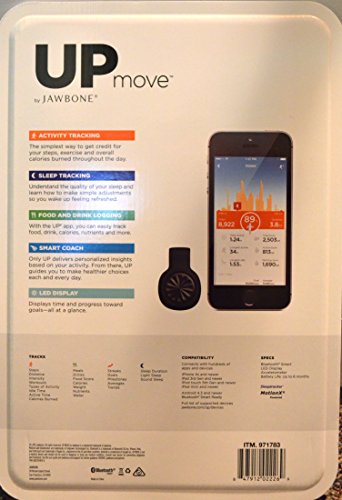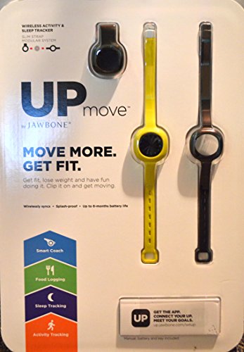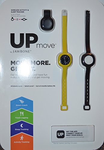 -. Binding : Misc. -. Brand : Jawbone -. Color : Yellow -. EAN : 0847912022269 -. Feature : Tracks activity, sleep, and food/drink / Connects with hundreds of apps and devices / Smart feature guides you through your goals / Splash proof; Up to 6 month battery life / LED display shows time and progress toward goals -. Label : Up Move -. Manufacturer : Up Move -. ProductGroup : Sports -. ProductTypeName : SPORTING_GOODS -. Publisher : Up Move -. Studio : Up Move -. Title : Jawbone up Move Activity Tracker, Onyx with Black Clip and Two Extra Straps, One Yellow and One Black -. UPC : 847912022269